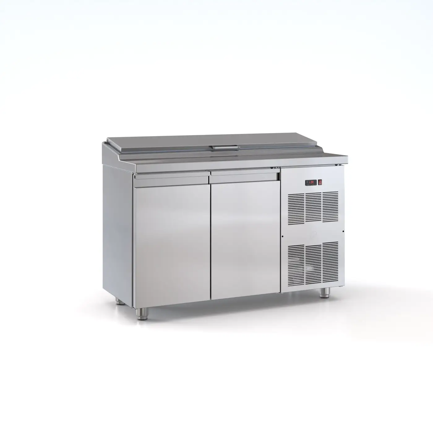 מקרר סלטיה מנירוסטה עם 2 דלתות קירור ופס סלטיה משופע לכיוון העובד עם מכסה נירוסטה